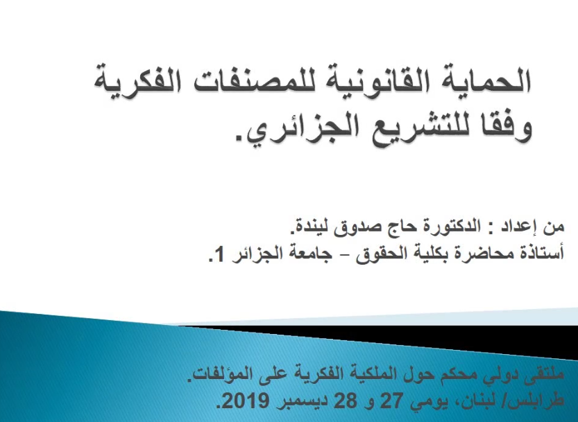 د. حاج صدوق ليندة، أستاذة محاضرة ب –تخصص ملكية فكرية، كلية الحقوق، جامعة الجزائر1.