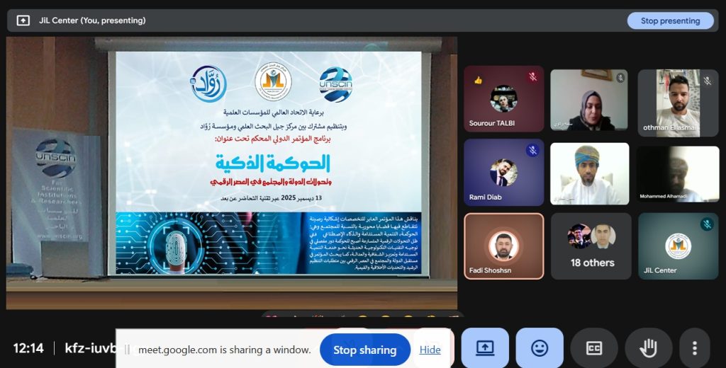 انعقد يوم السبت 13 ديسمبر 2025 المؤتمر الدولي المحكّم الموسوم بـ “الحوكمة الذكية وتحولات الدولة والمجتمع في العصر الرقمي“، برعاية الاتحاد العالمي للمؤسسات العلمية (UNSCIN)، وبتنظيم مشترك بين مركز جيل البحث العلمي ومؤسسة رُوَّاد.