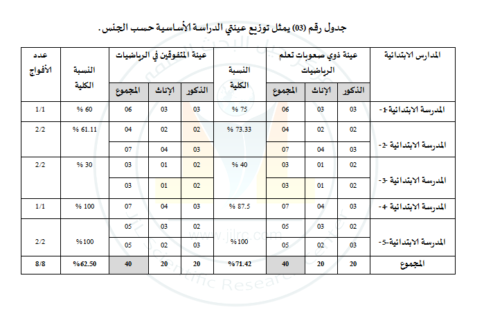 وقد أظهرت النتائج أن هناك فروقا ذات دلالة احصائية بين متوسطات أداء أفراد عينة ذوي صعوبات التعلم والتلاميذ المتفوقين دراسيًّا في الرياضيات لصالح هذه الأخيرة.